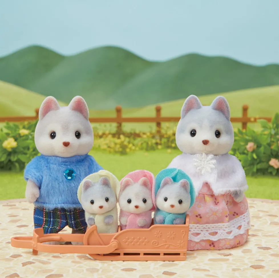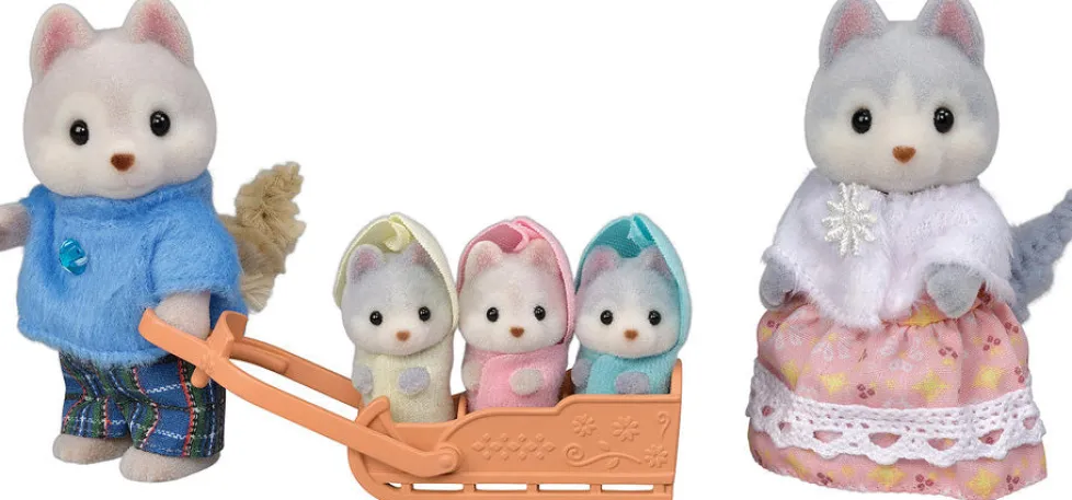 ・The Husky Family set contains five figures: father Vincent, mother Avril, and triplets Rae, Drake, and Nelly, as well as a sleigh for the triplets. The figures have beautiful gray and brown fur.