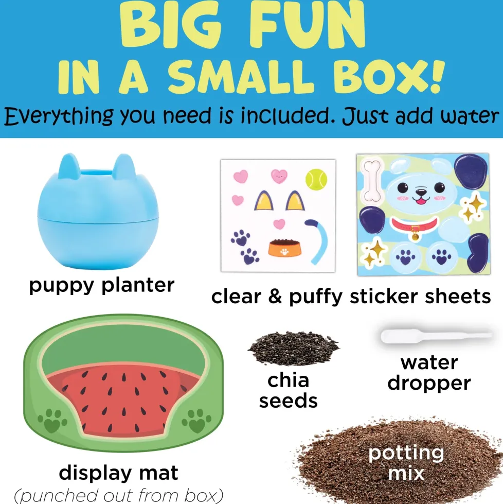 Contents Include: 1 Puppy planter, 2 sticker sheets, 1 Bag of chia seeds, 1 Bag of potting mix, 1 Water dropper and Instructions