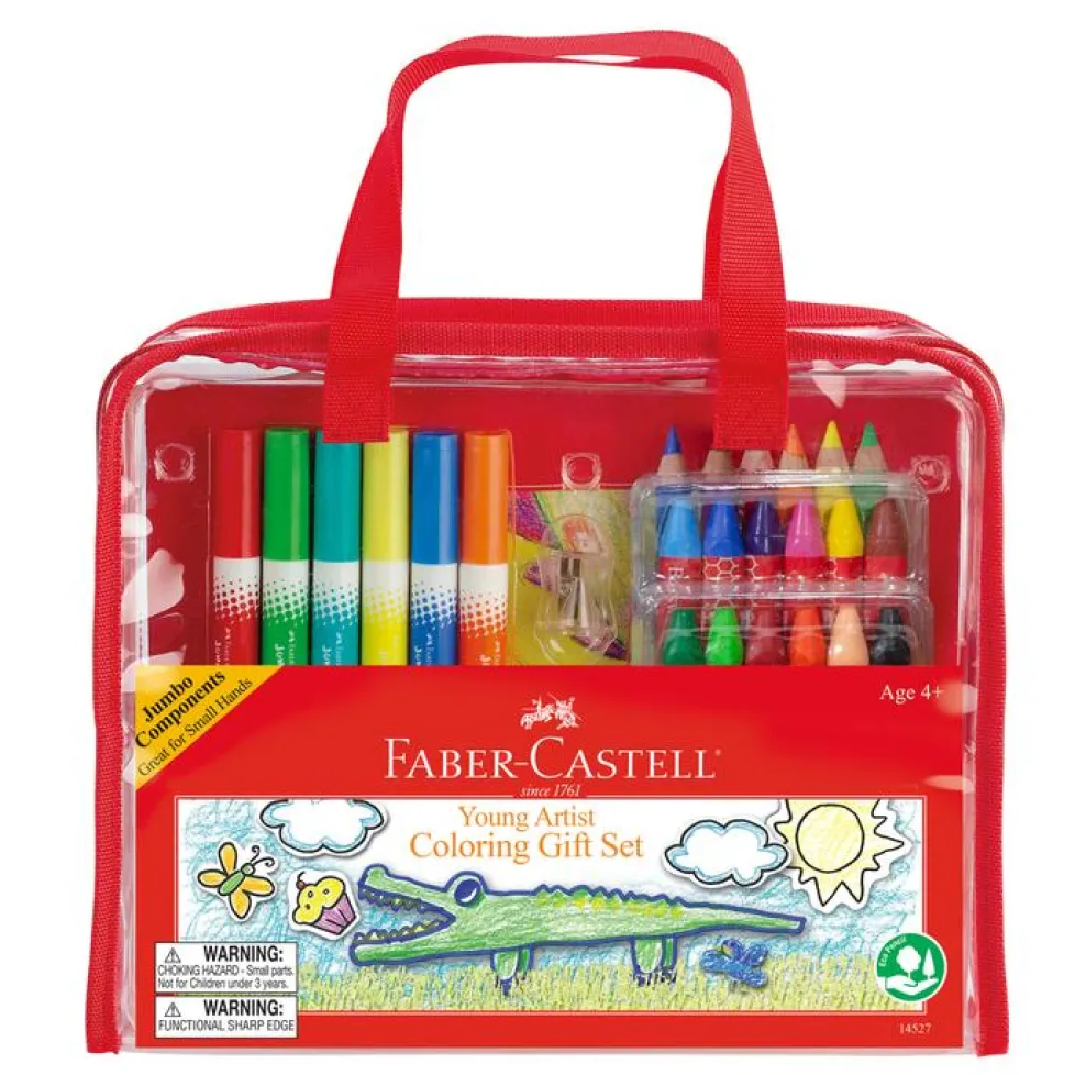 The Young Artist Coloring Gift Set features an assortment of our favorite Faber-Castell products for beginners, packaged in a handy reusable storage bag. Great for kids on the go! The crayons and colored EcoPencils feature a triangle shape – easy for little hands to hold and they won’t roll off the table.
