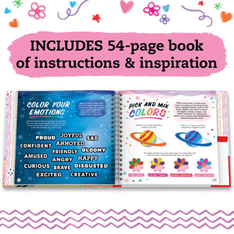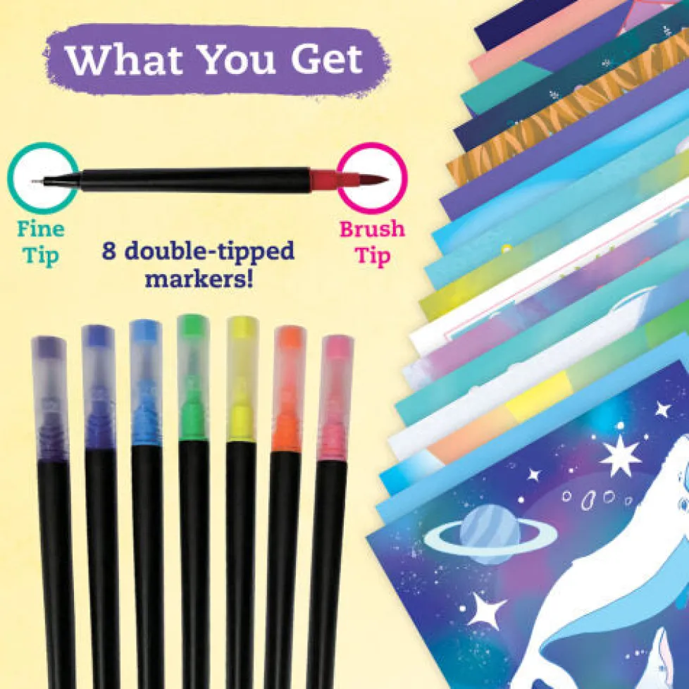 Creating art is a great way to help yourself feel calm. There are no rules in art, so feel free to color outside the lines. Includes eight double-sided pens that feature a brush tip on one end and a fine tip on each end. Inspired by mindful meditation, this reverse-style coloring book brings a less restrictive and mindful approach to line work, color, and creativity. Doodle and decorate through 19 pages of soft, painterly art with prompts for patterns and linework, and tons of practice activities to get you started.