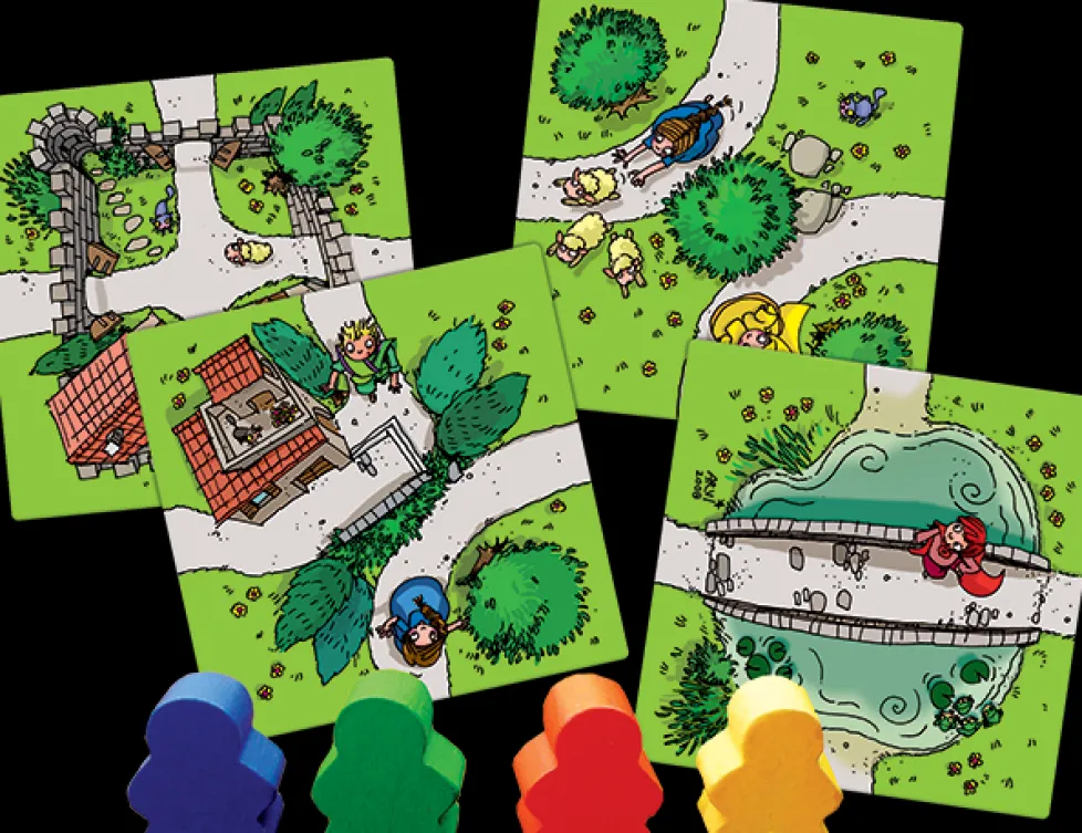 The city of Carcassonne is celebrating its national holiday. As is the tradition,people mark the occasion by setting the city’s sheep, hens, and cows loose in the streets. From dawn till dusk, the children of Carcassonne have the time of their lives trying to bring these animals back home. WithMy First Carcassonne, players of all ages can experience a new version of the modern classic. Each turn, you place a tile to build the Medieval city of Carcassonne. As the game progresses, the children of Carcassonne—illustrated on the cards—fill the streets trying to catch animals. Whenever you close a street with one or more children marked withyour chosencolor, you get to put pawns on the board. The first player to place all their pawns wins the game!