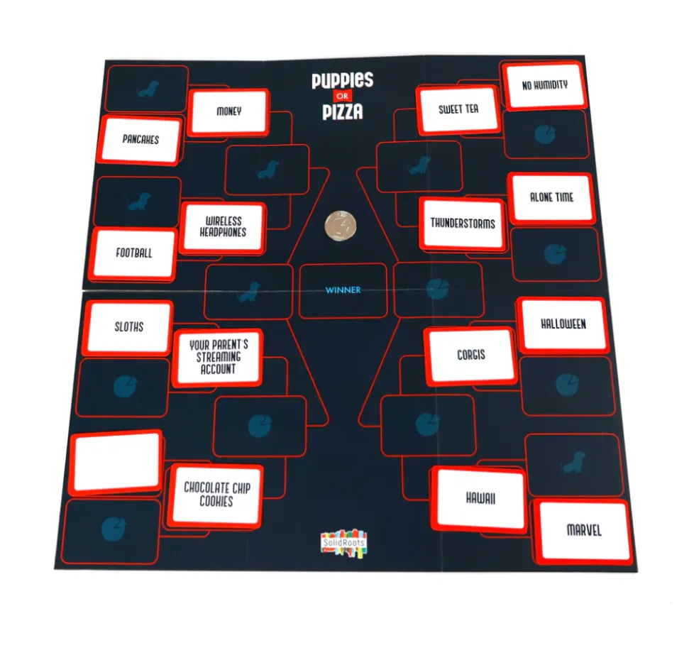 Puppies or Pizzacan be played multiple ways, but the easiest is to draw cards, set them up on the board in a tournament-style bracket, and vote on each set until you only have 1 card left.