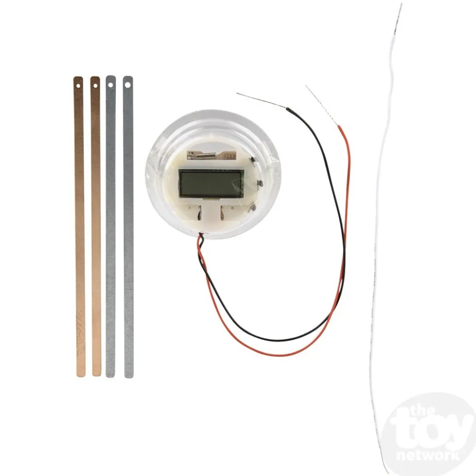 Setup and connect the LCD watch with this KidzLabs – Lemon Clock Kit. Attach the wires to a lemon or other food with similar properties and watch it turn on. Lemon is not included. Each piece is on a blister card.