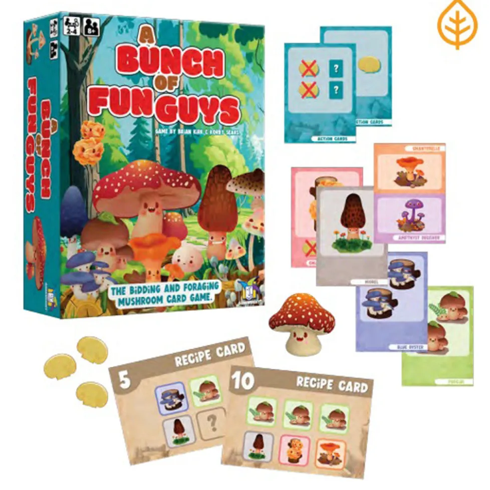 In the mycological bidding gameA Bunch of Fun Guys, players use foraging cards to collect mushroom cards to fulfill recipes. Do you want to get only one mushroom but have first pick of the choicest truffles? Or are you willing to take whatever is leftover for a chance at three mushrooms — or even four? Some mushrooms will let you take special actions when you collect them. Complete the most recipes to win!