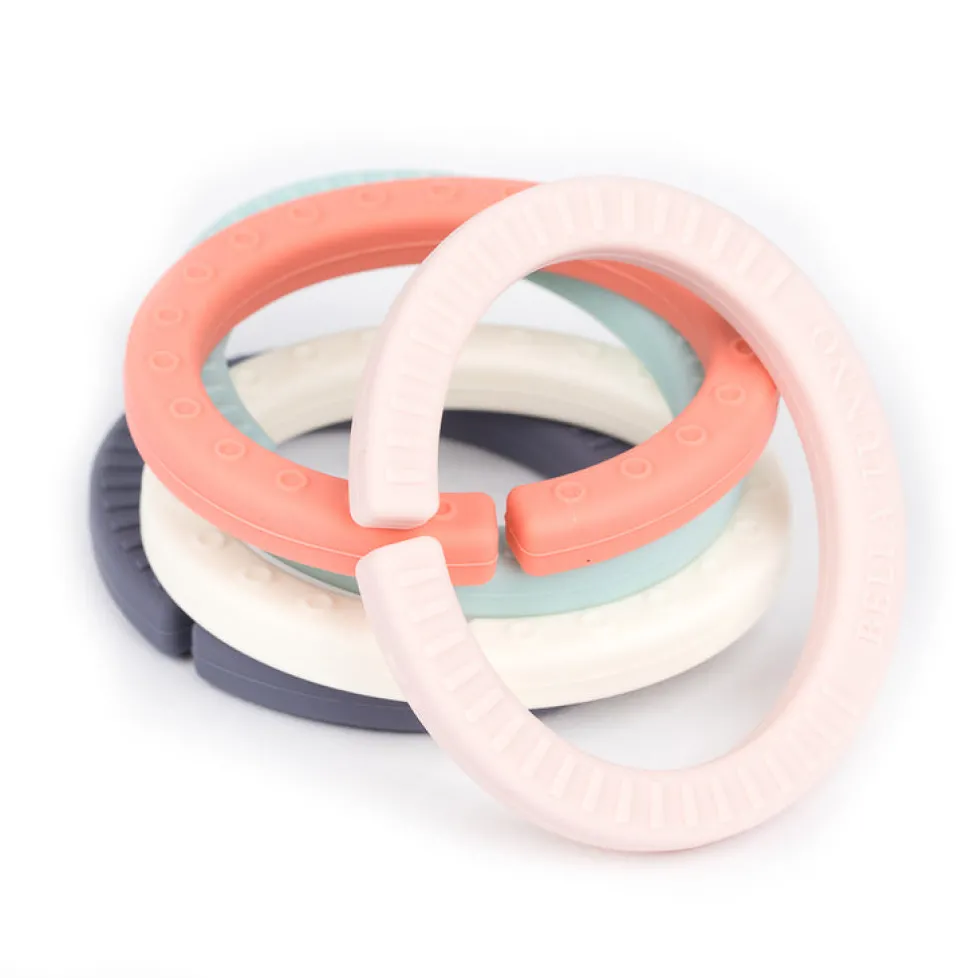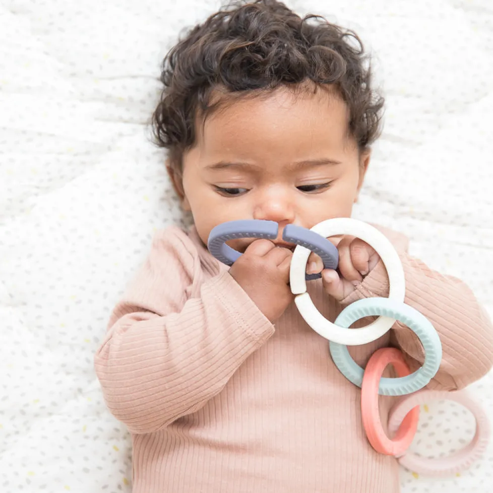 Introducing your new favorite product. Is it a toy? A teether? A link? Yes, it is. It’s pretty much magic what our Happy Links can do. We took the classic link and made it into the product we wish we had for our littles. Generously sized, easy to grip and wrapped in food-grade silicone, our links relieve little gums, keep toys and lovies attached and keeps kids entertained. Our Happy Links set includes 5 links for teething playing and organizing. Attach them to the stroller, rocker, play gym, or carrier to bring the fun wherever you go.