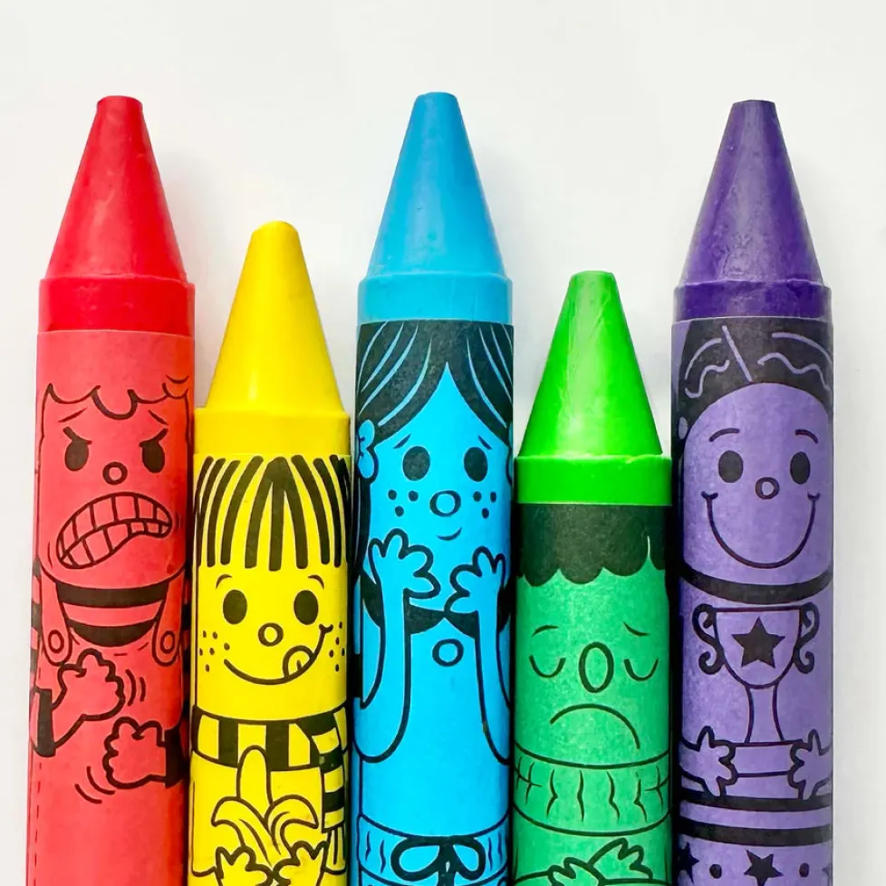 A clever twist on a classic box of crayons, with tons of built-in activity! 8 jumbo crayon “people” have lots of personality! Meet Yummy Yellow, Grumpy Green, Proud Purple and their friends. 60-page coloring book features the world of these colorful characters, with rooms to color, favorite things, connect the dots and other fun activities. There are even extra crayon wrappers to cut out when your crayons get shorter from use! Use your characters to color, and play with them as figures!