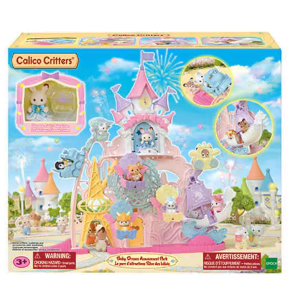 This fun dream-like amusement park comes complete with a castle featuring a clock and a variety of exciting attractions. It comes with the Chocolate Rabbit baby dressed in a princess dress. Each attraction can be enjoyed by the babies and cradled babies. The hands on the clock can be moved. The Ferris wheel can be spun around. The unicorn-themed Viking ship can be swayed together with the waves. The horse-drawn carriage souring through the sky can be moved from left to right. The steam train can be driven up and down. The skyship can carry a cradled baby.