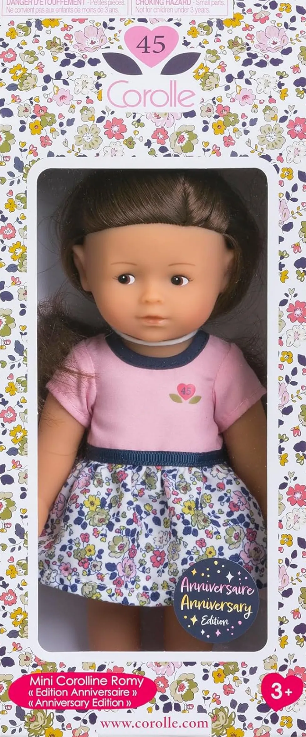 Mini Corolline Romy Anniverary Edition is a petite 8-inch doll ready to offer for any gift-giving occasion, and the ideal size to slip into a bag or backpack and accompany your child all day long. She has an all-vinyl body that is soft to the touch and delicately scented with vanilla, a Corolle signature, blue painted eyes and long brown hair. Created to honor Corolle’s 45th anniversary, this Romy wears a charming floral-print dress with a special logo and matching molded shoes (not removable). Rosy, Romy, Rosaly or Ruby — every child can choose their favorite Mini Corolline or collect them all! Ages 3 and up.