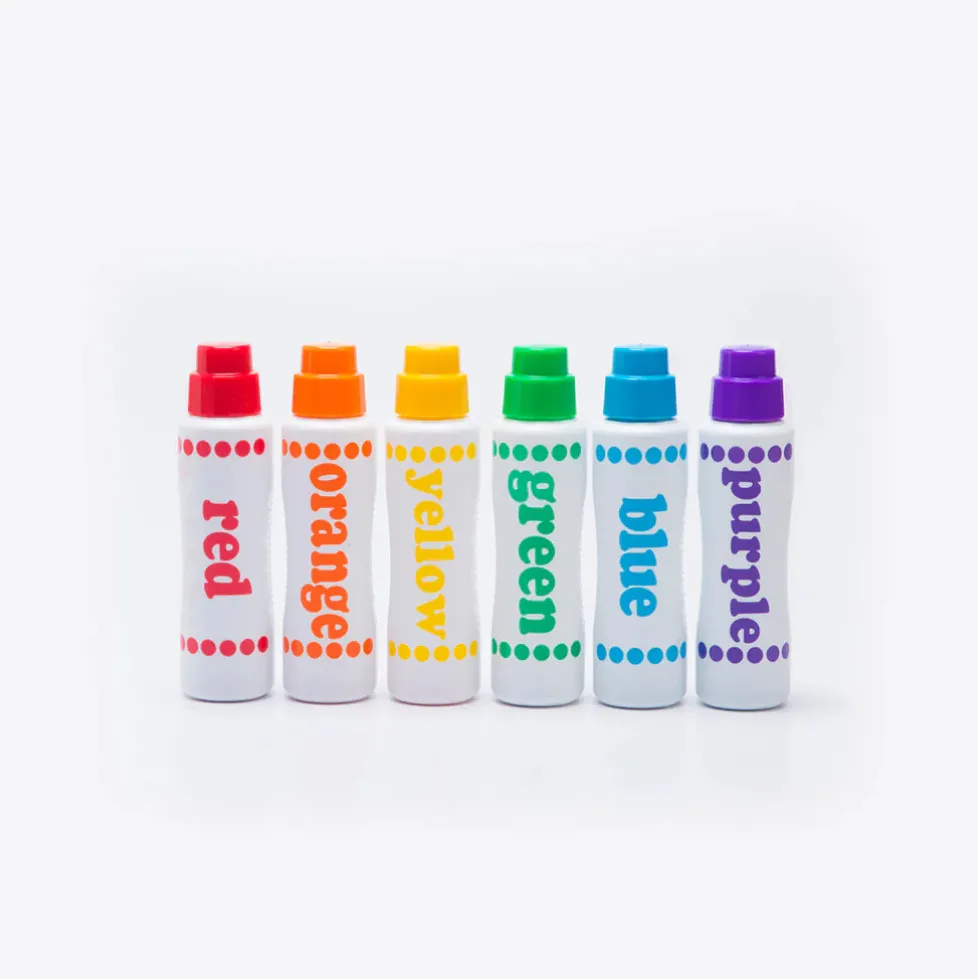 Do A Dot Art! This set comes with 6 washable dot markers in no spill, no splash bottles, which is a dream come true for parents and teachers. Do A Dot Art! is incredible for developing hand eye coordination and color recognition for young children, and is the first art medium every young child should use. Let your imagination run wild with this set of primary rainbow colors.