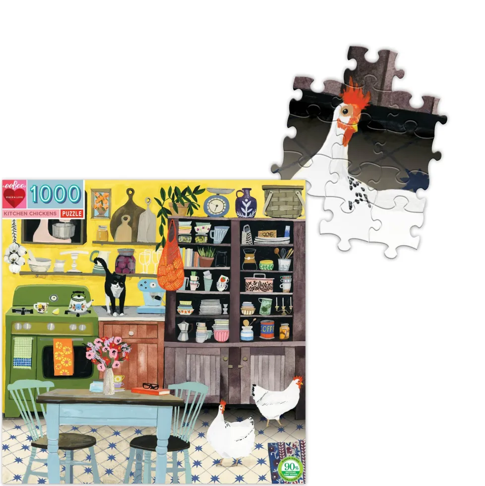 Cluck Cluck Meow! Puzzle your way through eeBoo’s Kitchen Chickens 1000 Piece Puzzle. This charming country kitchen has a few friendly fowl and one curious cat. Jigsaw puzzles are a great activity for the whole family to enjoy. Featuring art by Anisa Makhoul (@anisamakhoul).