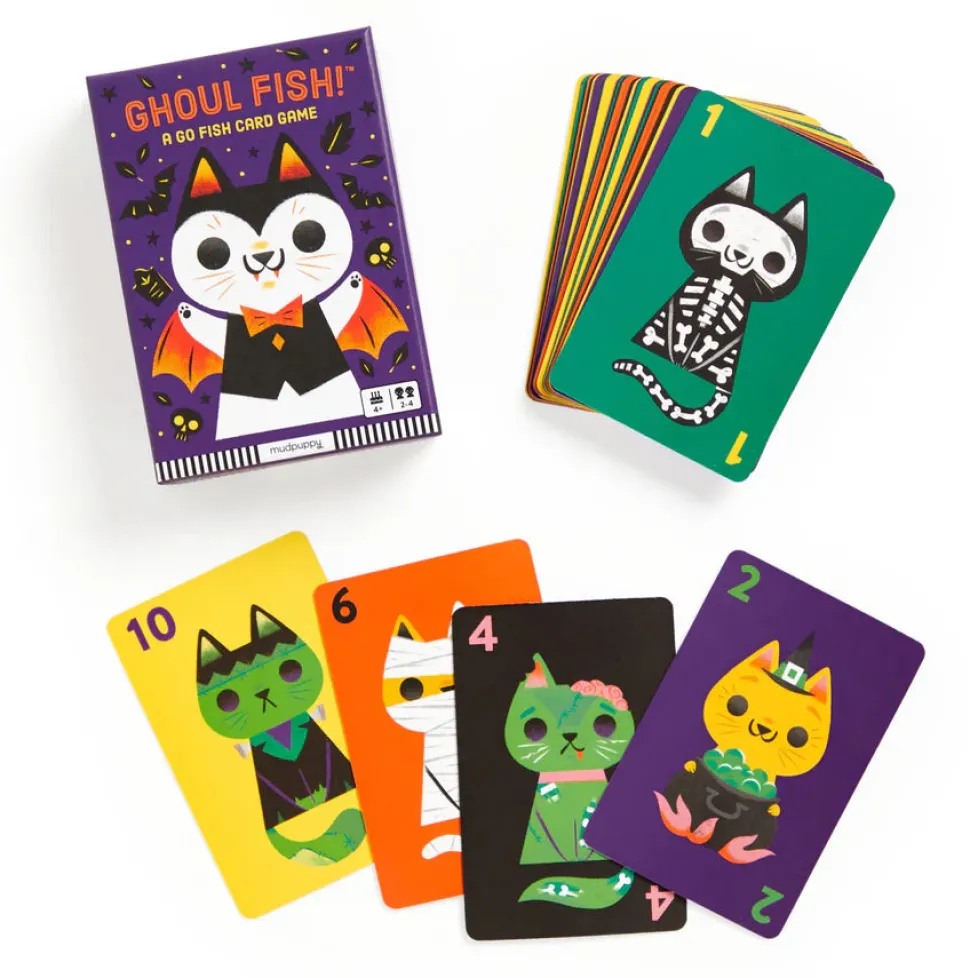 Ghoul Fish! from Mudpuppy is a spooky spin on the classic game of Go Fish. Collect the most sets of 4 matching cats to win a purr-fect game for Halloween boo baskets!