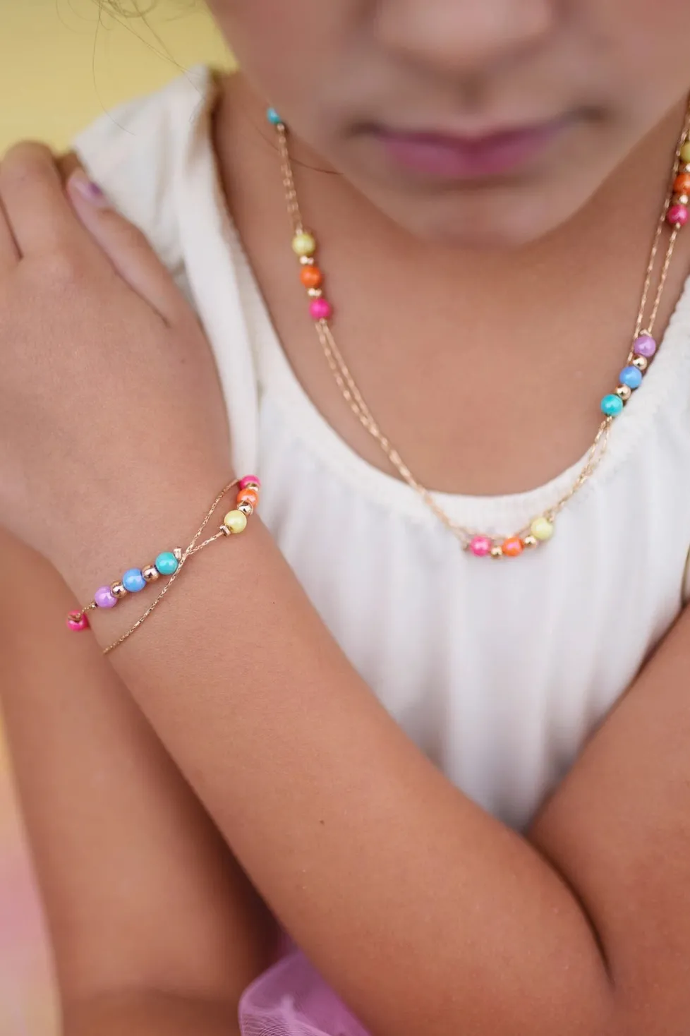 A unique pairing of dainty gold chains with pearly rainbow & metallic beads makes our Boutique Golden Rainbow bracelet as elegant as it is fun. Pair it with the Boutique Golden Rainbow necklace to complete the look.