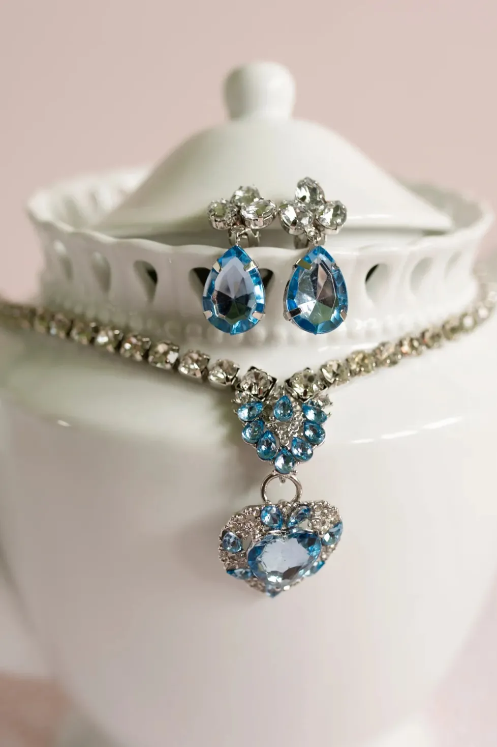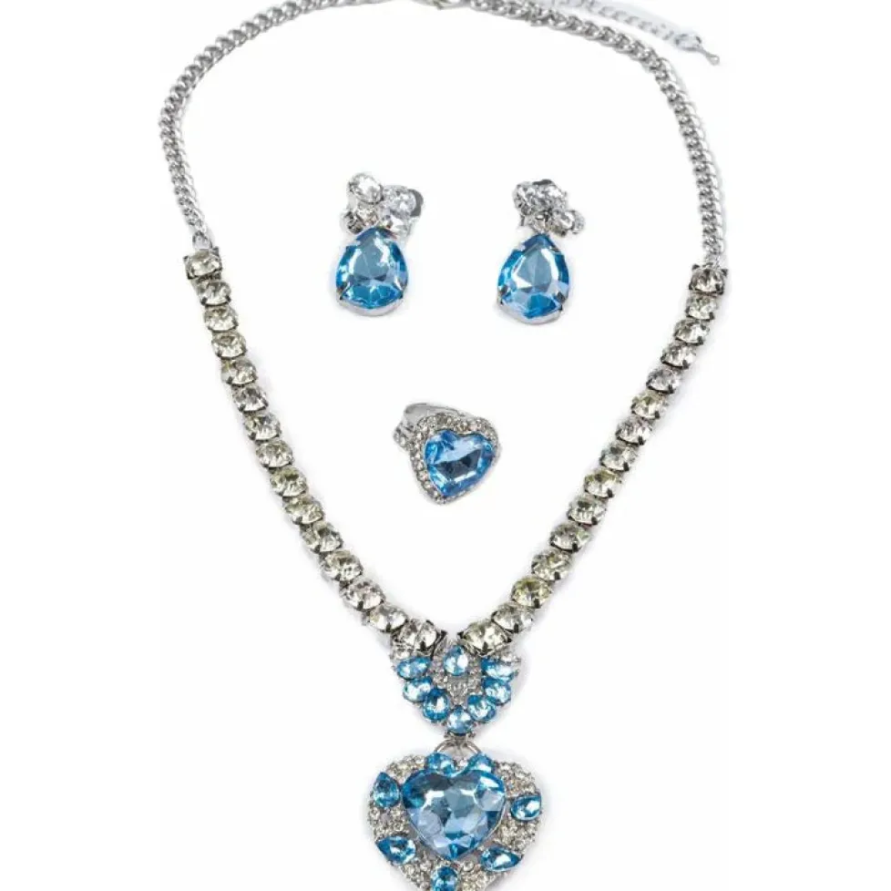 Classic glamour gets a modern twist with The Marilyn 4 Piece set. This bold and beautiful boxed-set includes blue & silver clip-on earrings, a heart-shaped ring, and a coordinating necklace jam-packed with jewels.