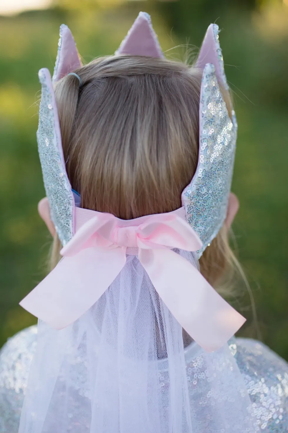 All princesses need a crown! This soft-sided crown is covered in silver iridescent sequins and is lined with soft pink satin to make playtime comfortable. To top it off this crown has a beautiful long veil made of soft pink tulle.