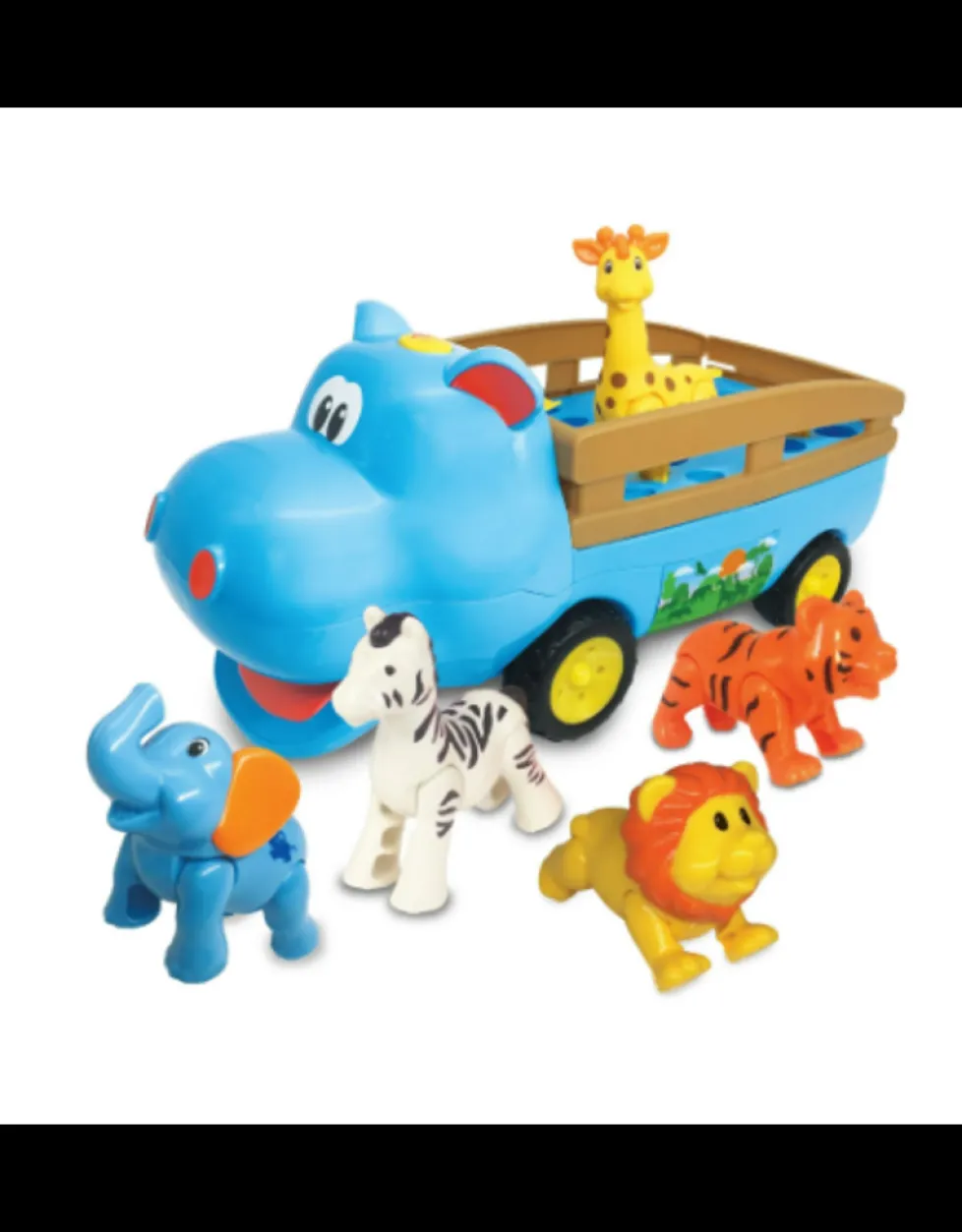 Free rolling action. Insert jungle animals for animal sounds! Button on top of truck activates engine and music sounds. Hippo mouth moves as vehicle rolls. Includes 5 safari animals.