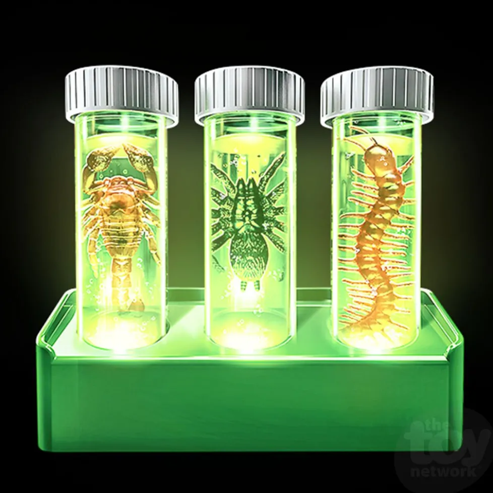 Display creepy crawlies in the light-up test tubes with the KidzLabs – Glow Critter Lab kit. Great for room decoration. 2 x AAA Batteries are required. Each piece is in a color box. 6.6 x 8.5 x 2.3 inches.