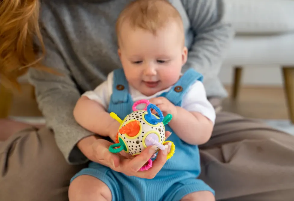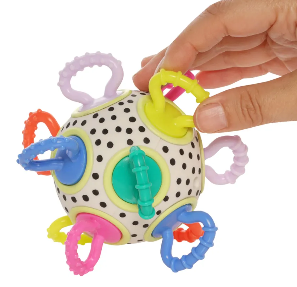 Cheer for a toy with soft plastic handles that click with every twist and a center ball filled with beads that rattles with every shake!