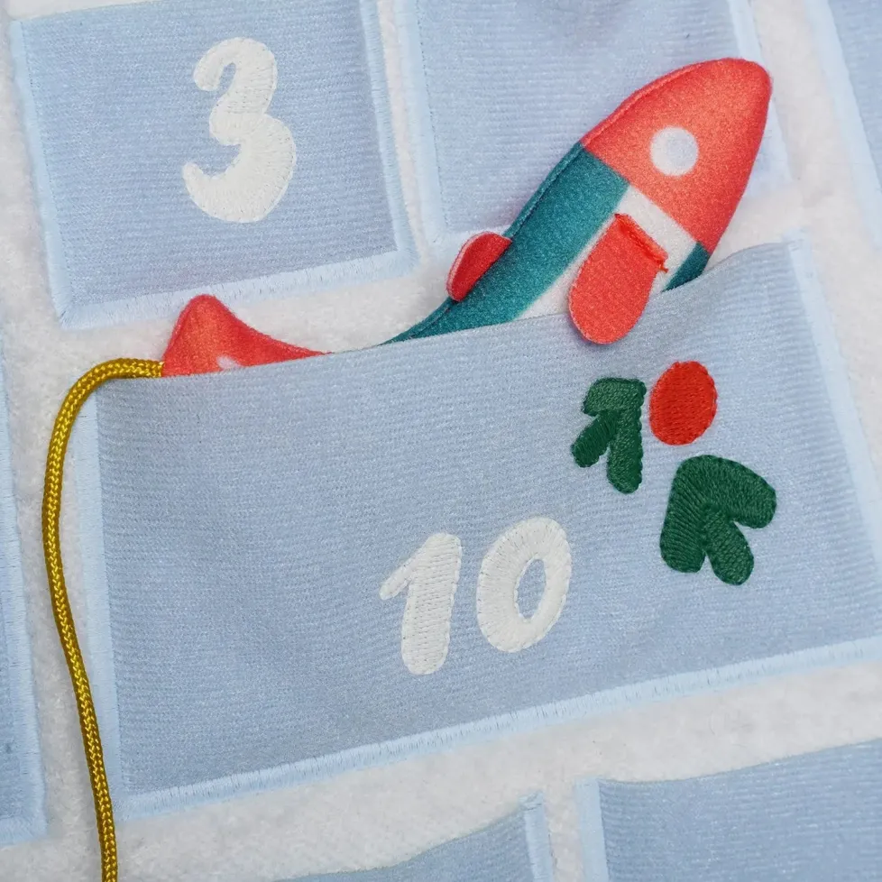 A Christmas countdown with a penguin twist. The Polly Penguin Advent Calendar features a soft plush design with 24 numbered fabric pockets, a tethered stuffed fish for marking the number of days till Christmas, and a loop atop the penguin’s head for hanging. Made from various soft fabrics, the penguin’s head, arms, and feet are plump with fluff. The calendar belly has no plush fillers but offers pockets for placing the attached fish or other small surprises. Fill your little one’s holiday with anticipation and wonder with this penguin-inspired advent calendar.