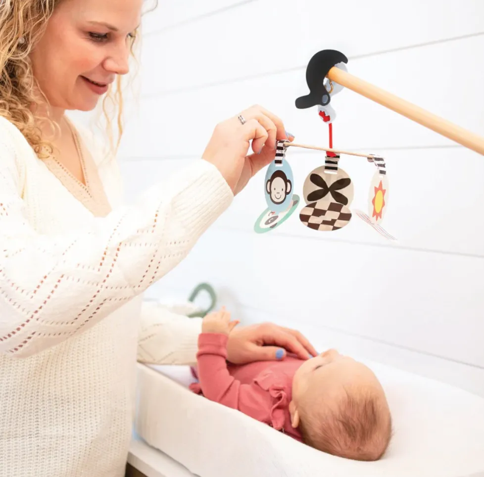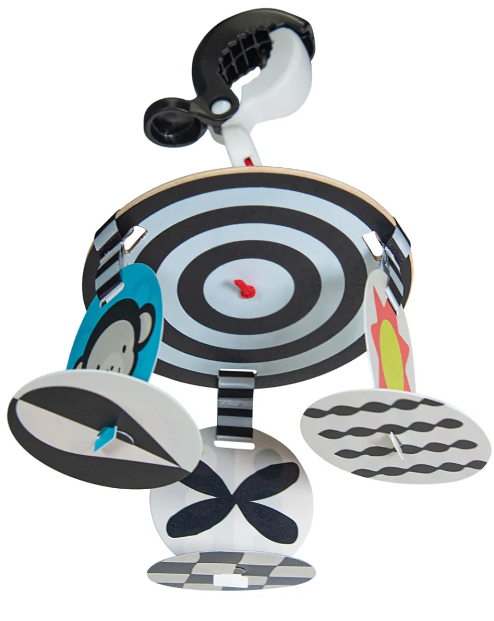 Clip-n-go fun for the stroller, carrier, or above the diaper changing station. High-contrast graphics captivate baby and support visual development!