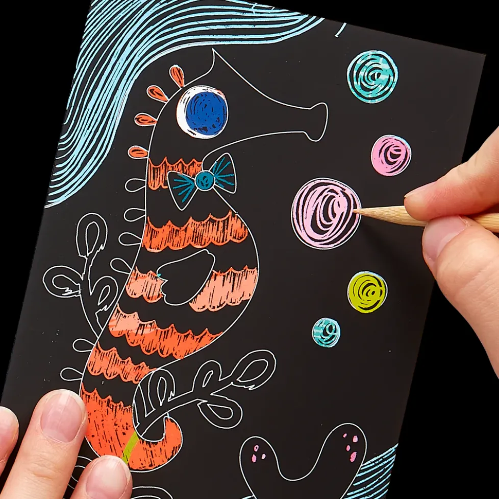 Get busy scratching because the ocean adventure has started! These fun friendly fish themed scratch art cards are filled with easy-to-follow guidelines to reveal the ocean inspired rainbow art work. Sized for on-the-go fun at 4 x 6 inches these mini scratch art kits for kids are great for travel. Each kit not only has 4 cute fish illustrated cards, but 2 blank cards for creating your own designs, all revealing a rainbow of color using the included wooden stylus.