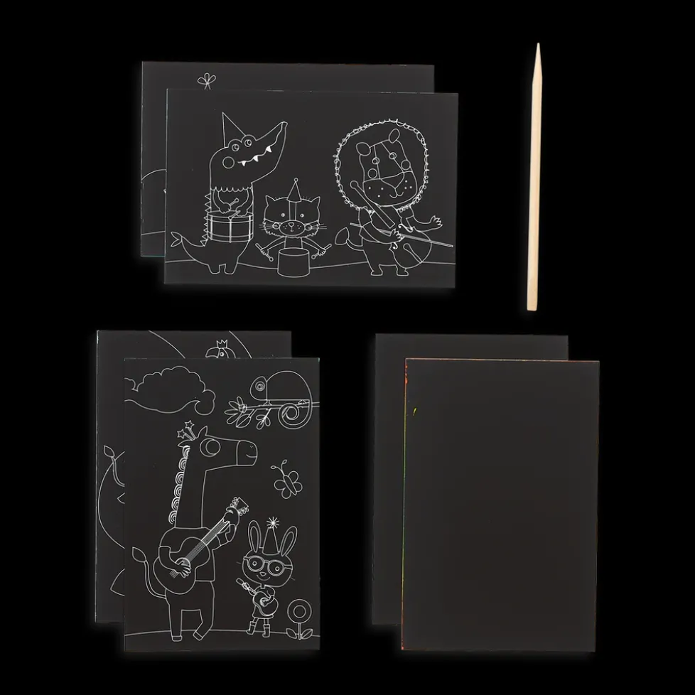 Get busy scratching because the Safari Party has started! These fun safari themed scratch art cards are filled with easy-to-follow guidelines to reveal the jungle inspired rainbow art work. Sized for on-the-go fun at 4 x 6 inches these mini scratch art kits for kids are great for travel. Each kit not only has 4 cute safari illustrated cards but 2 blank cards for creating your own designs, all revealing a rainbow of color using the included wooden stylus.