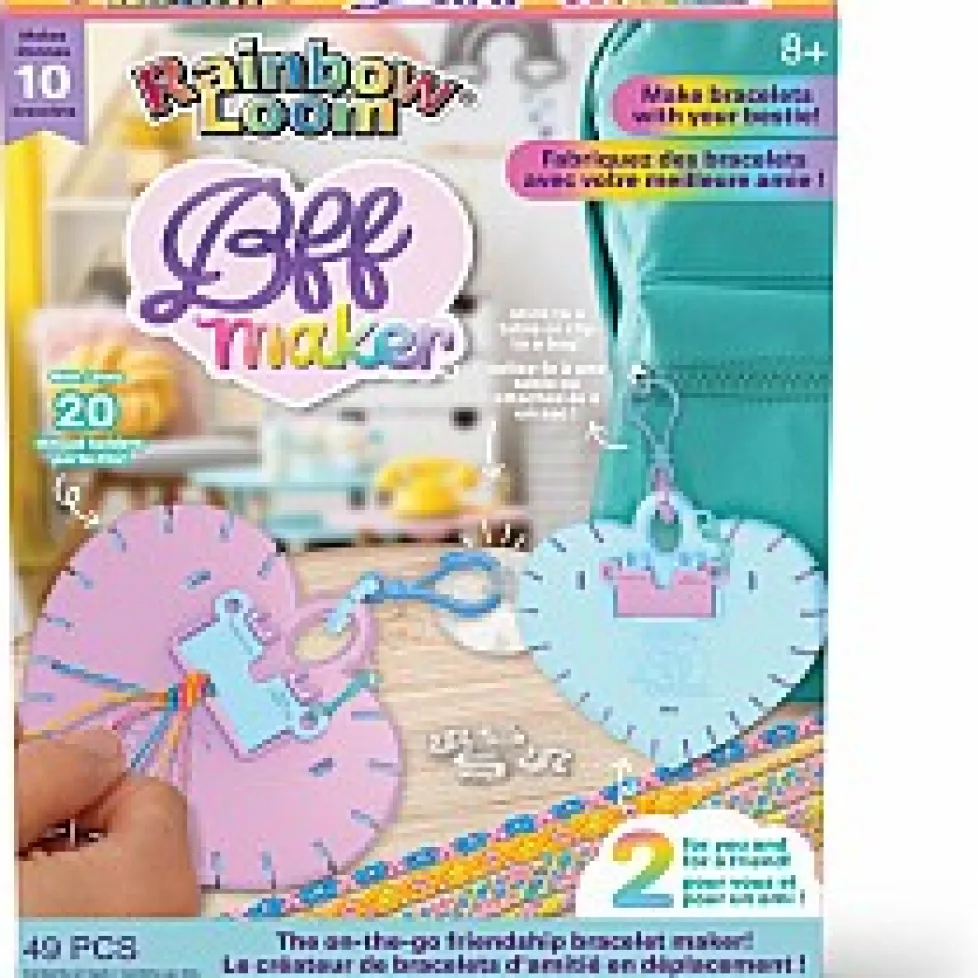 Tween and teen BFF’s make DIY bracelets on the go with this simple kit! The two heart-shaped looms make it easy and fun for besties to weave 10 different bracelet designs. They clip to backpacks for on-the-go weaving, or suction cup to flat surfaces like windows whenever creativity strikes. This makes a great birthday gift! Includes 2 BFF heart looms, 2 keychain hooks, 52 yards of thread in 6 colors, 30 S-clasps to make wearing bracelets easy, and 2 suction cups.