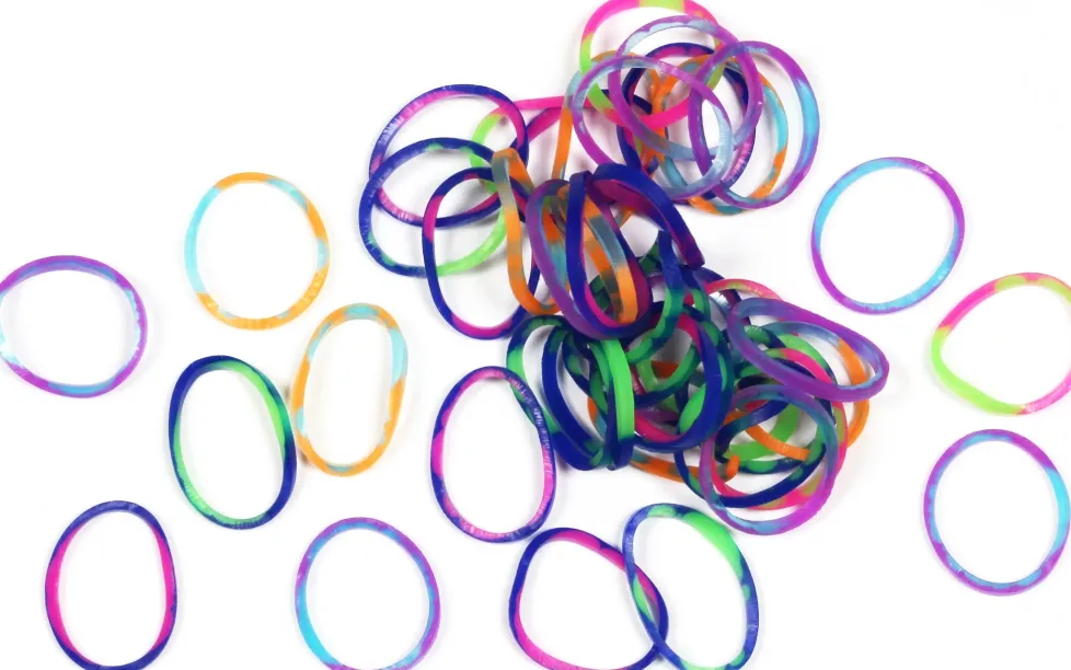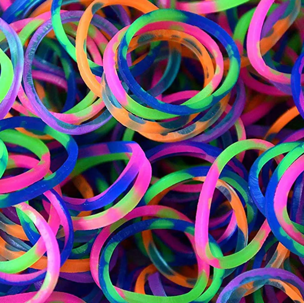 Mixed/assorted tie-dye (jelly). Colors may vary. 600+ non-latex rubber bands & a bag of 24 C-clips.