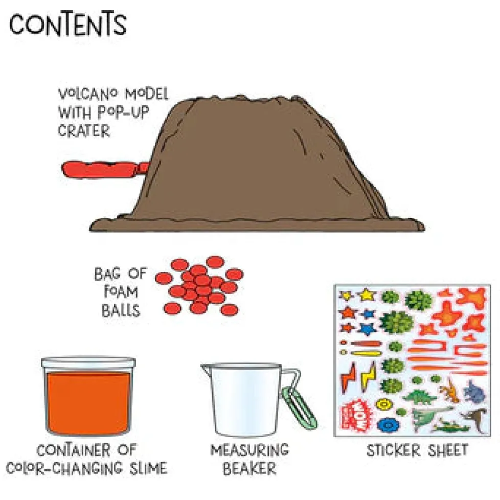 Erupt your own volcano again and again! Press down on the “lava lever” a few times and — WOW! The crater pops up and the slime lava flows down its sides. The volcano works with three types of eruptions: heat-activated color-changing slime “lava”, soft foam “lava-rock” balls, and the classic vinegar-and-baking-soda reaction with ingredients from your kitchen cupboard. Customize your volcano with fun stickers of trees, plants, dinosaurs, and more.