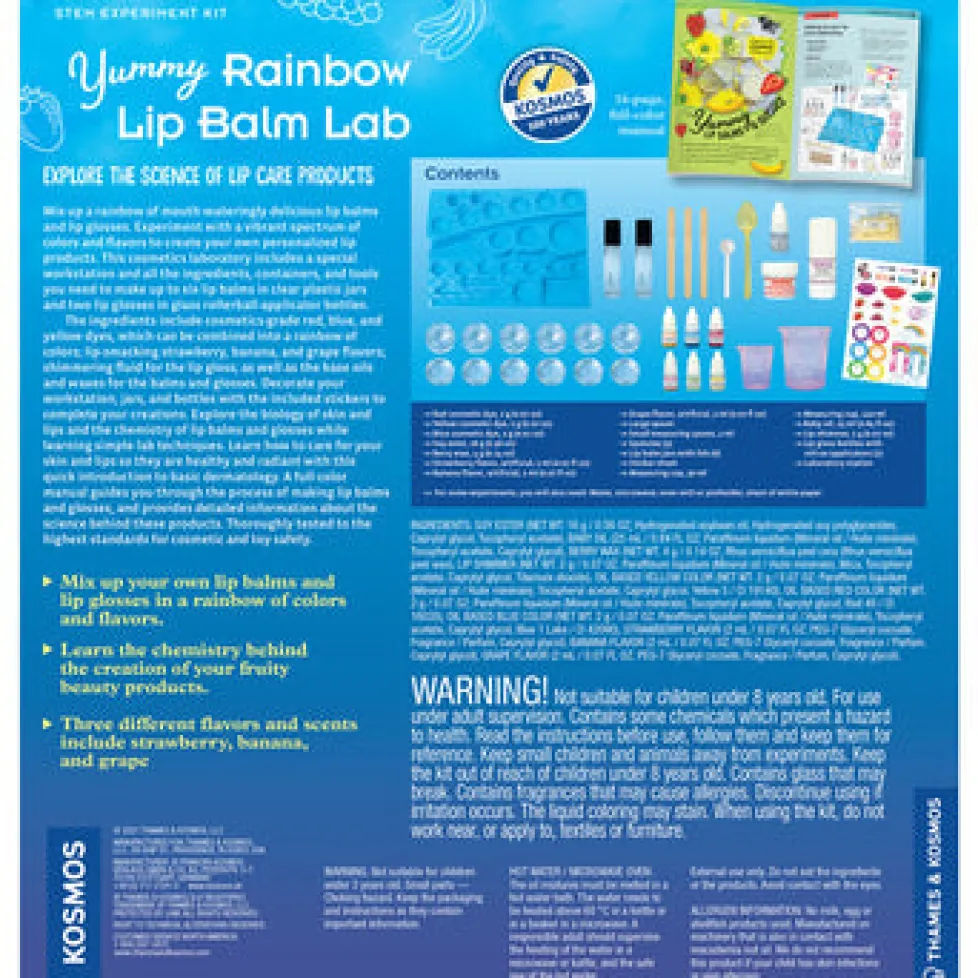 Mix up a rainbow of mouth-wateringly delicious lip balms and lip glosses. Experiment with a vibrant spectrum of colors and flavors to create your own personalized lip products. This cosmetics laboratory includes a special workstation and all the ingredients, containers, and tools you need to make up to six lip balms in clear plastic jars and two lip glosses in glass rollerball-applicator bottles. The ingredients include cosmetics-grade red, blue, and yellow dyes, which can be combined into a rainbow of colors; lip-smacking strawberry, banana, and grape flavors; shimmering fluid for the lip gloss; as well as the base oils and waxes for the balms and glosses. Decorate your workstation, jars, and bottles with the included stickers to complete your creations. Explore the biology of skin and lips and the chemistry of lip balms and glosses while learning simple lab techniques. Learn how to care for your skin and lips so they are healthy and radiant with this quick introduction to basic dermatology. A full-color manual guides you through the process of making lip balms and glosses, and provides detailed information about the science behind these products. Thoroughly tested to the highest standards for cosmetic and toy safety.